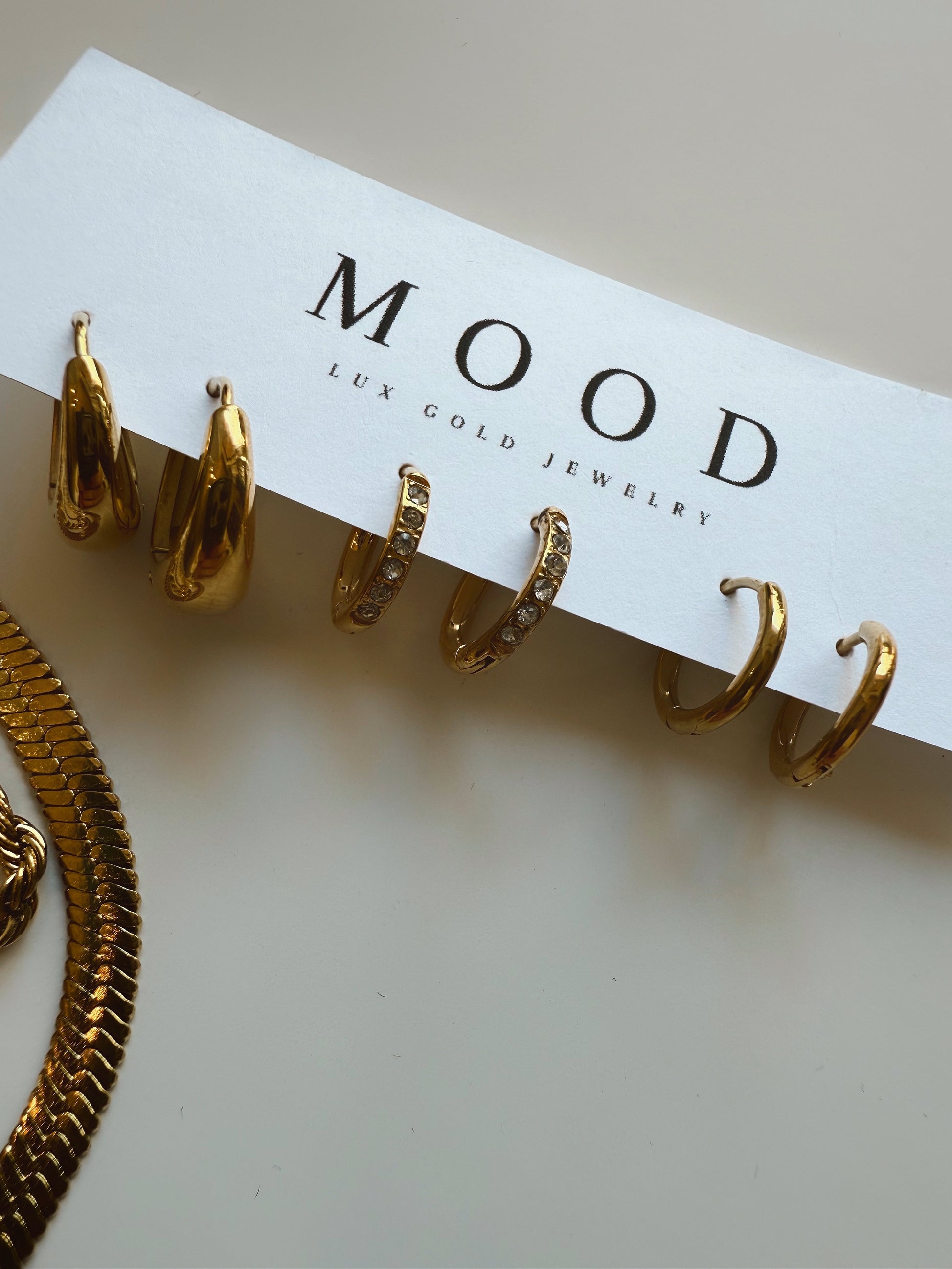 Your go-to gold trio. The Gym Essentials Huggie Set includes three 18k gold-plated styles—smooth, ridged, and pavé sparkle—perfect for everyday wear. Waterproof, tarnish-free, and hypoallergenic, these lightweight huggies KEEP UP!