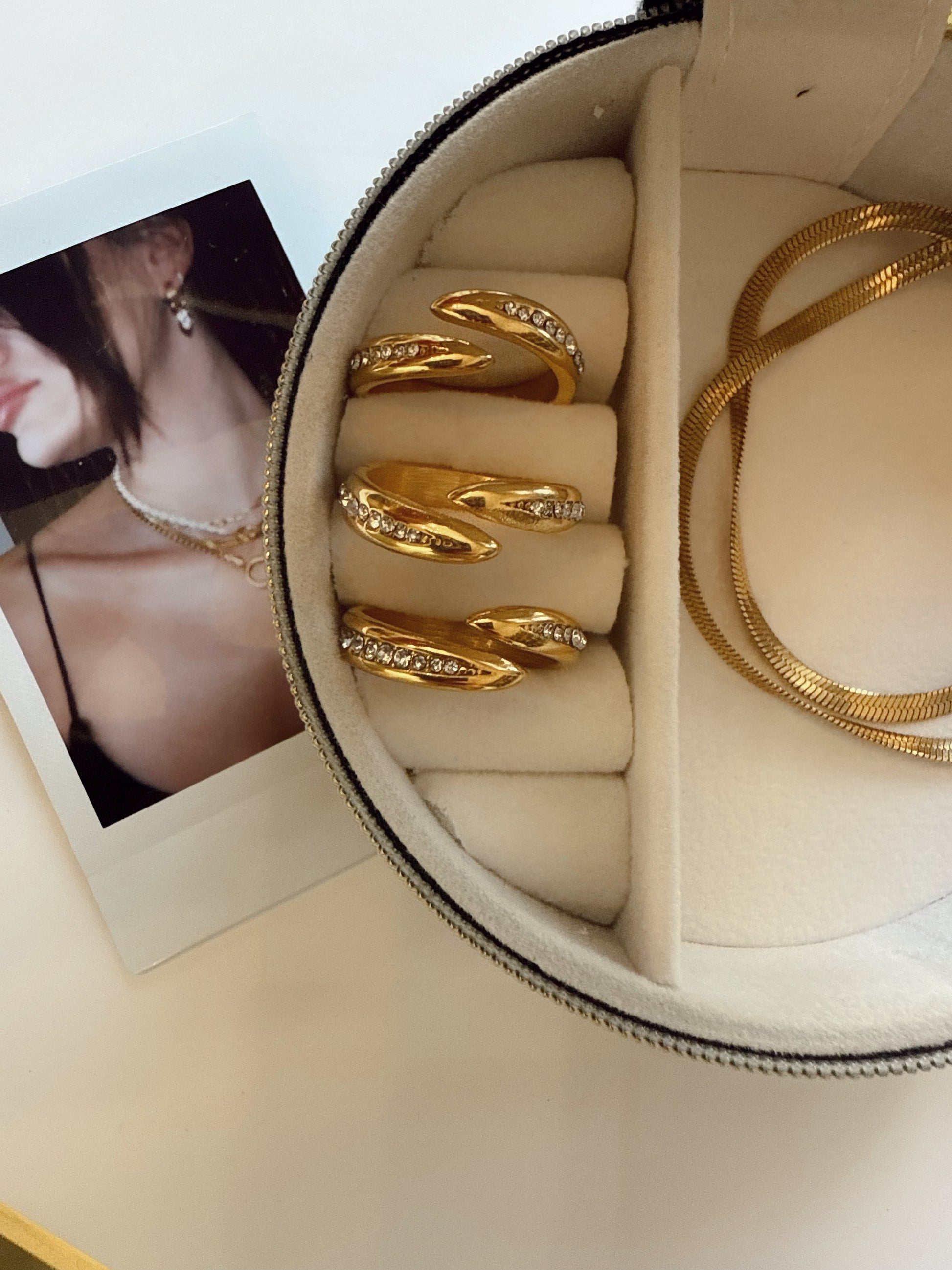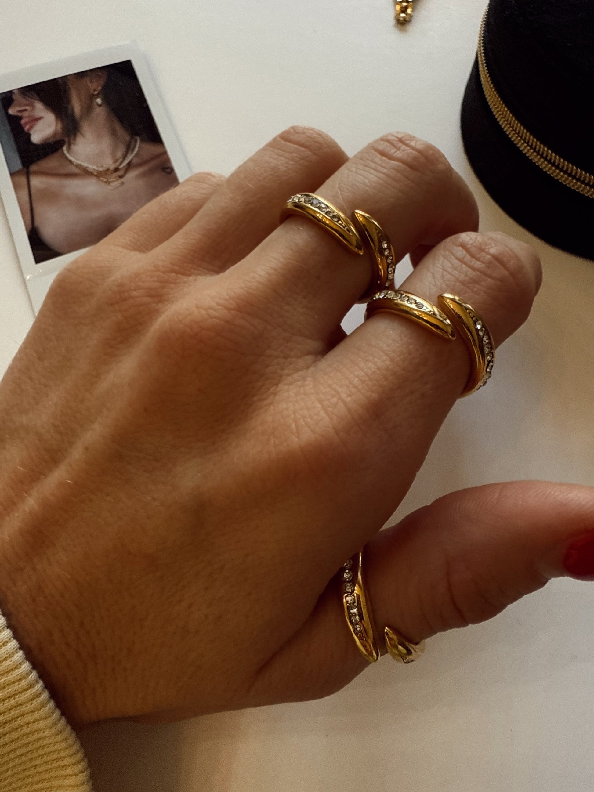 The Callie Ring is where minimal meets statement. Designed with a sculpted wrap shape and crystal-lined edges, this piece adds just the right amount of sparkle for your everyday stack. Bold yet refined — the kind of ring you’ll reach for again and again.