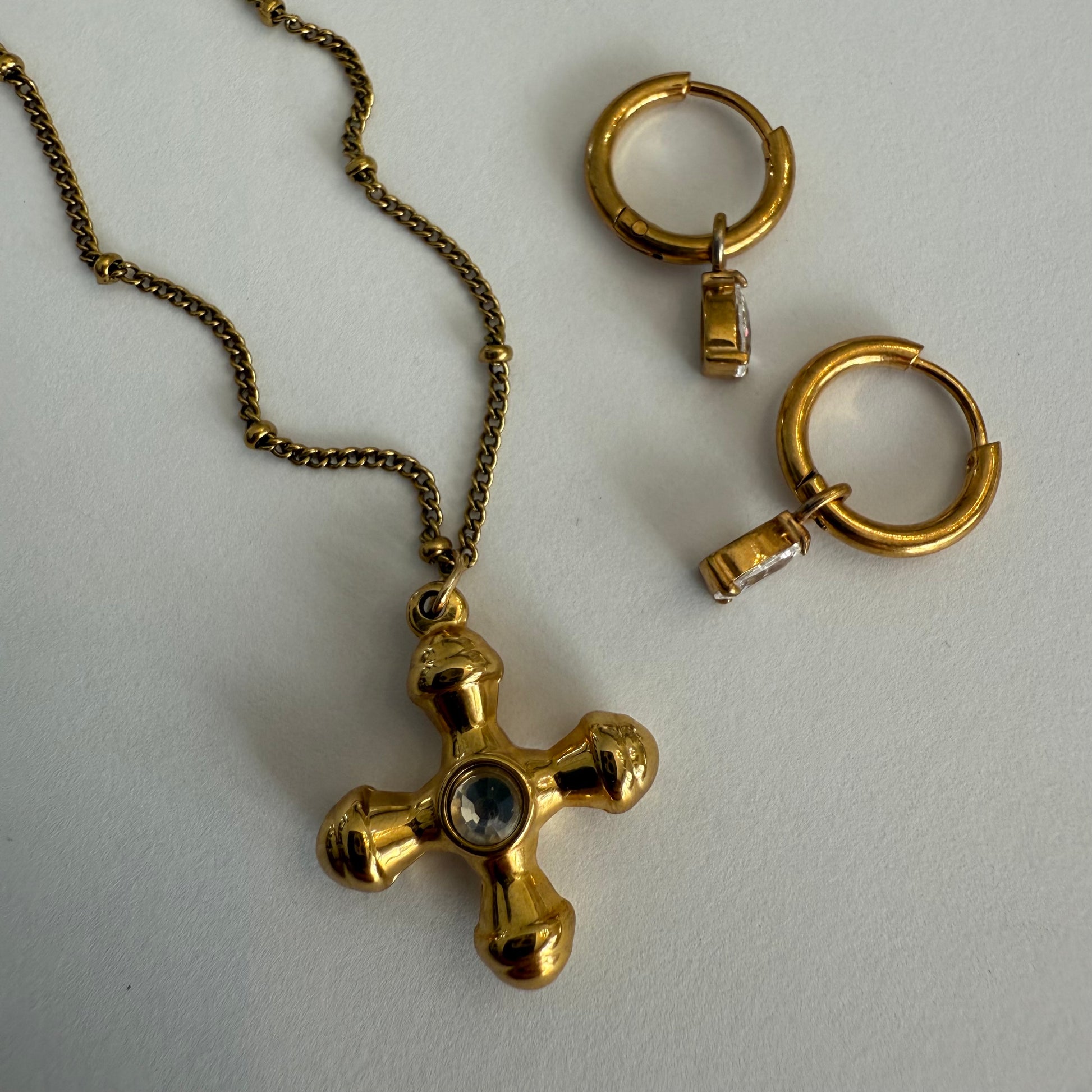 A bold symbol of strength and style. The Crystal Amulet Necklace features a dimensional 18K gold-plated cross pendant with a radiant crystal center, suspended from a sleek gold chain. Luxe, modern, and designed to stand out.