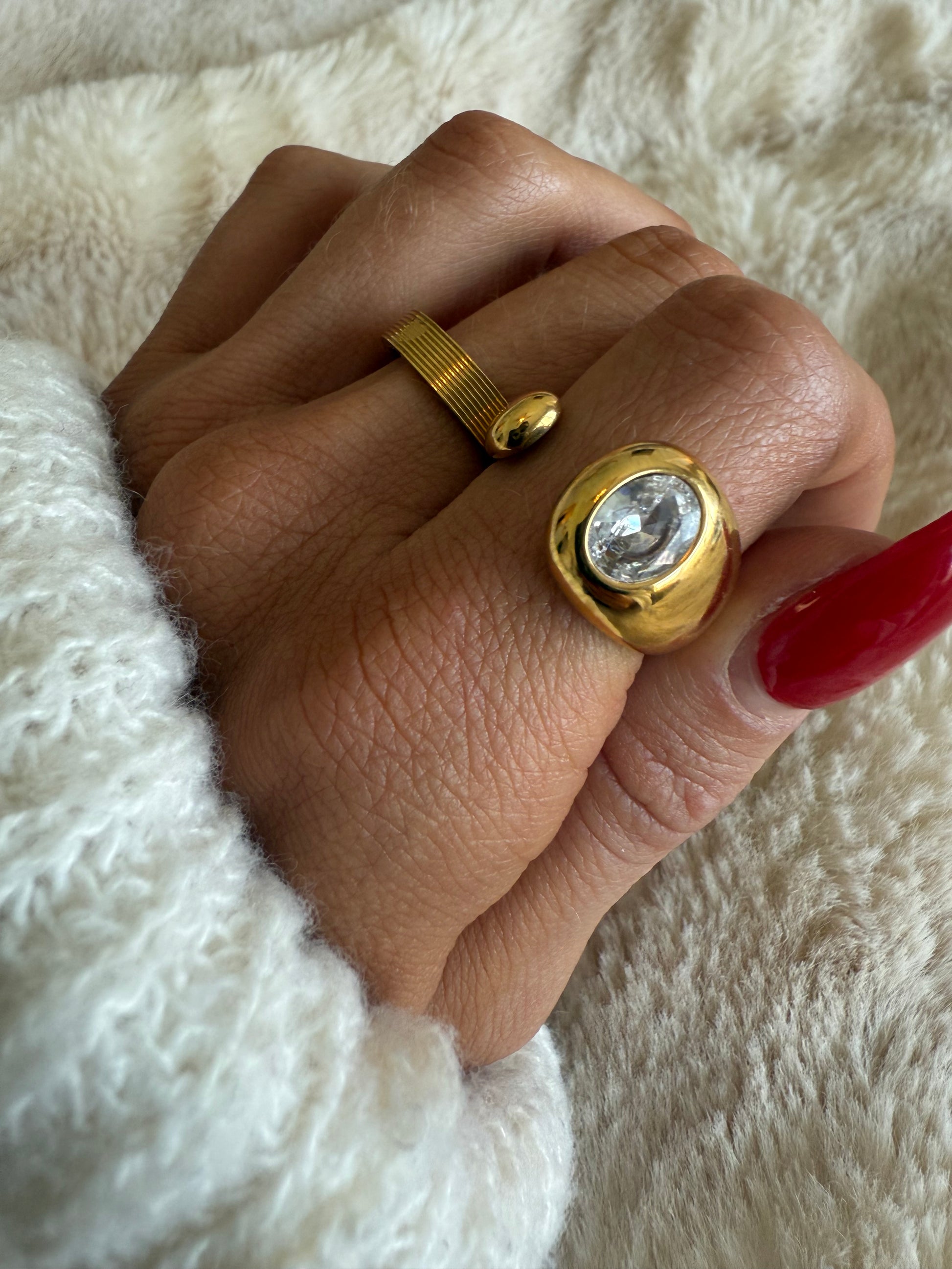 Sculptural and sleek, the Denna Diamond Ring is where minimalism meets statement. Featuring a bezel-set CZ stone on a smooth open gold band, this waterproof, tarnish-free ring is bold enough to stand alone yet refined enough to stack with your Mood favorites.
