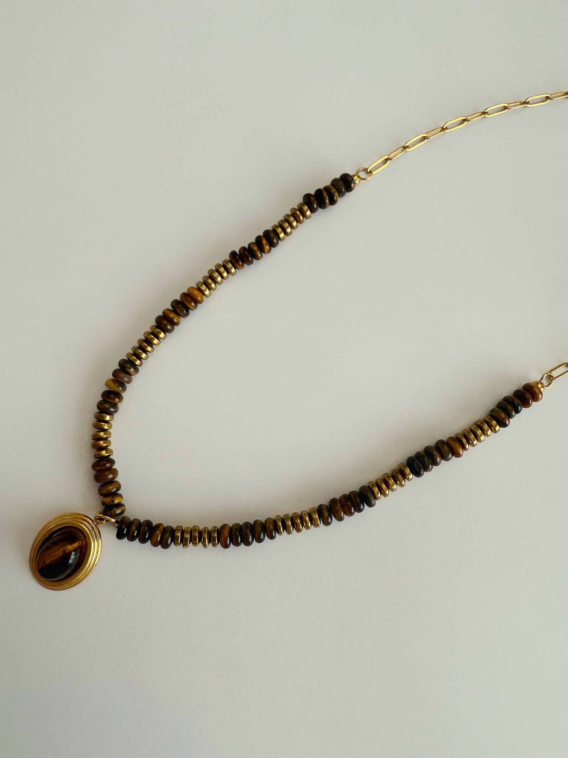 Meet the Charlottesville Pendant Necklace — a retro-inspired beauty with rich brown beads, golden accents, and a tiger eye-style charm that radiates grounded energy. With a hint of vintage and a touch of desert magic, this piece adds instant warmth to your stack.