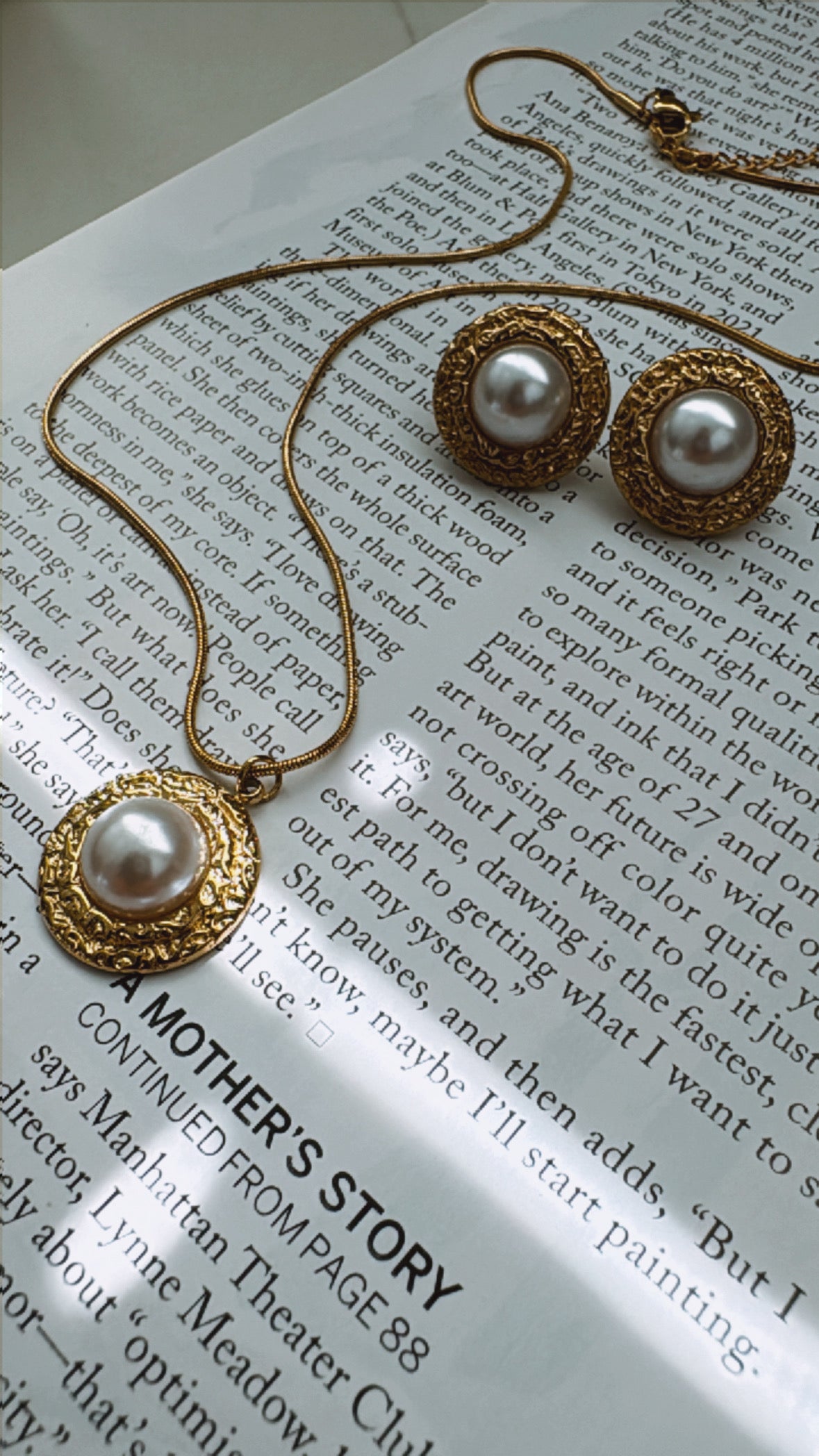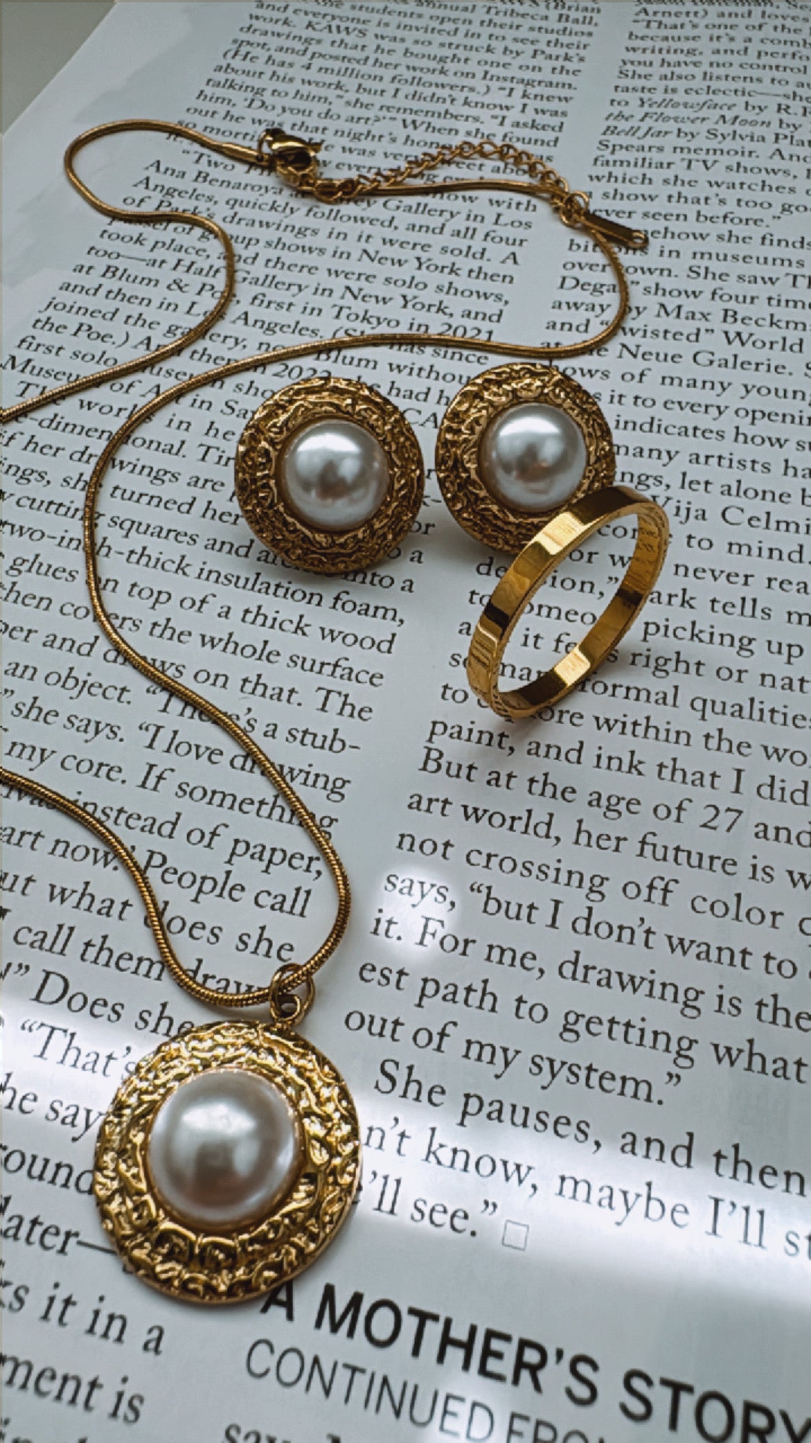 A nod to timeless elegance with a bold, modern twist. The Diana Pearl Necklace features a luminous oversized pearl framed by an intricate gold medallion, anchored on a sleek snake chain. It’s giving royalty — without trying too hard.