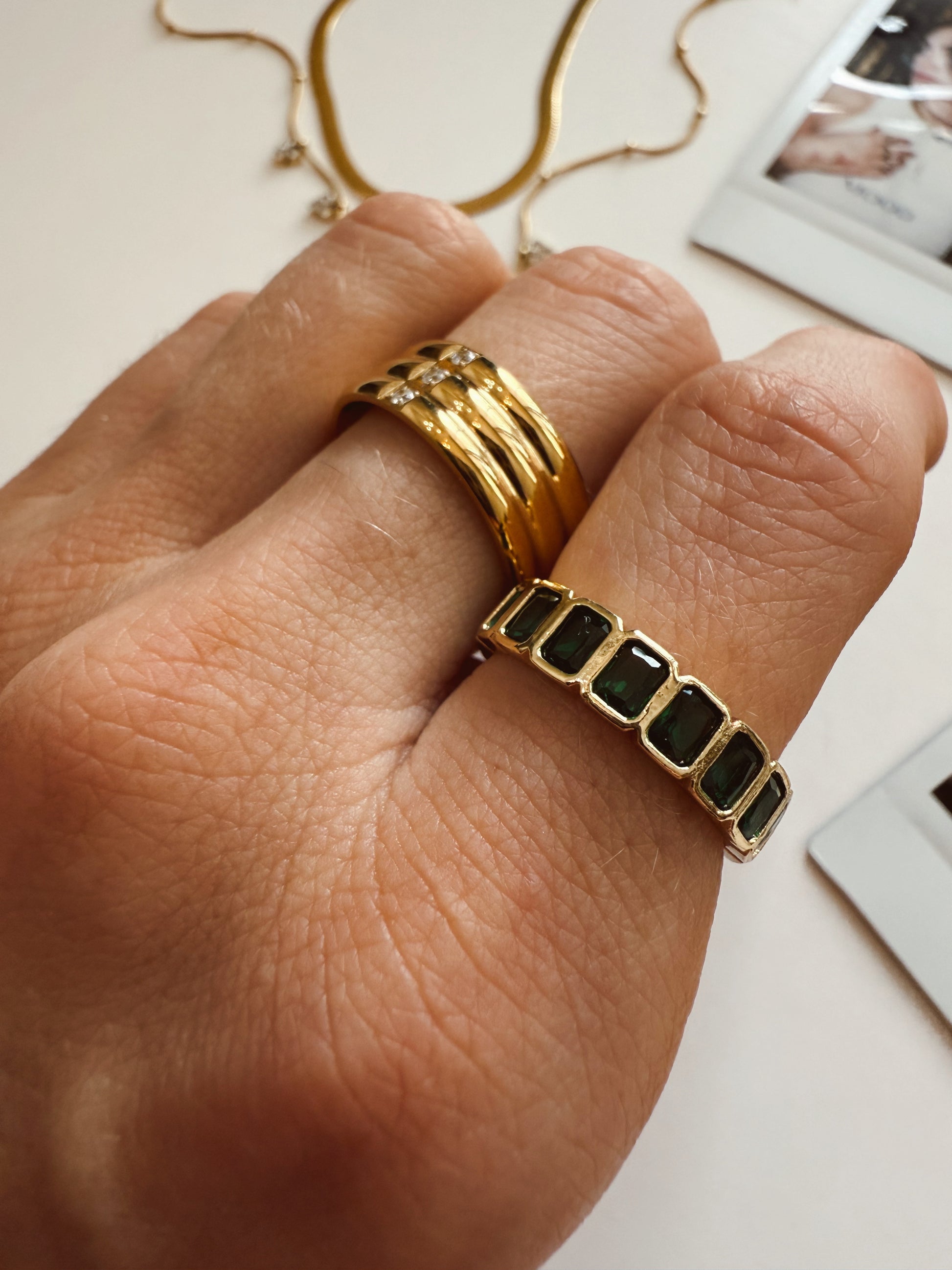 Pair the Eloise Emerald Ring with your gold stack or wear it solo as a subtle pop of color that instantly elevates any outfit.