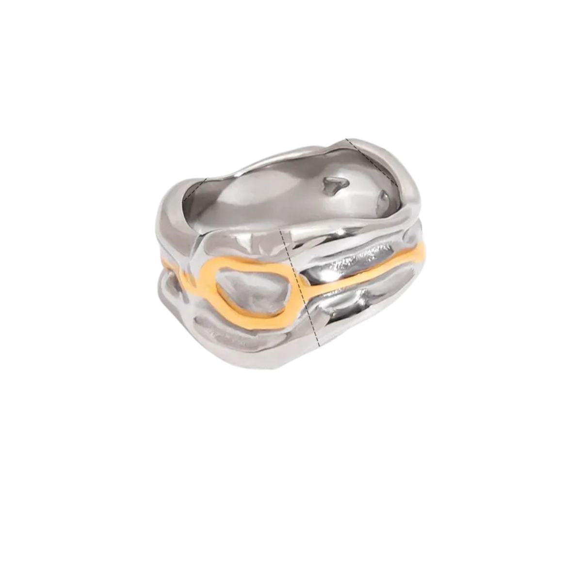 A modern classic with a molten twist. The Faye Ring features a sculptural, organic design with sleek silver curves accented by a subtle gold wave — a bold yet timeless piece made to shine from every angle. Waterproof, tarnish-free, and effortlessly elevated.