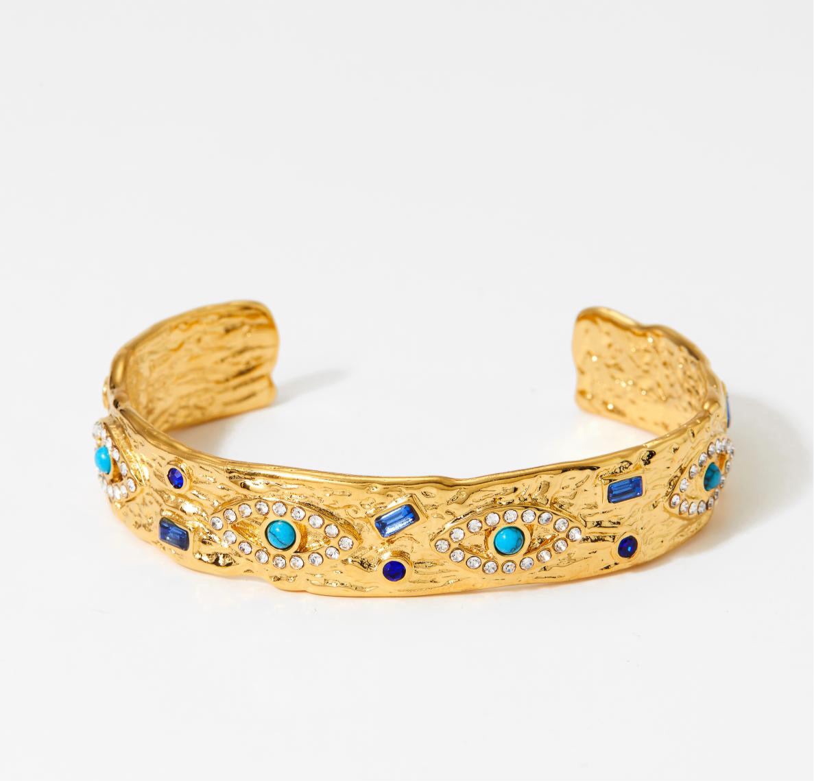 Embrace bold festival vibes with this gold evil eye bangle that doubles as a chic protective bracelet. Embellished with crystal-studded evil eye charms and lustrous pearls on a textured gold cuff, it radiates boho glam brilliance while guarding you from negative energy. This statement piece is the epitome of festival jewelry meets luxury—drawing all eyes on you (in the best way) wherever you go.