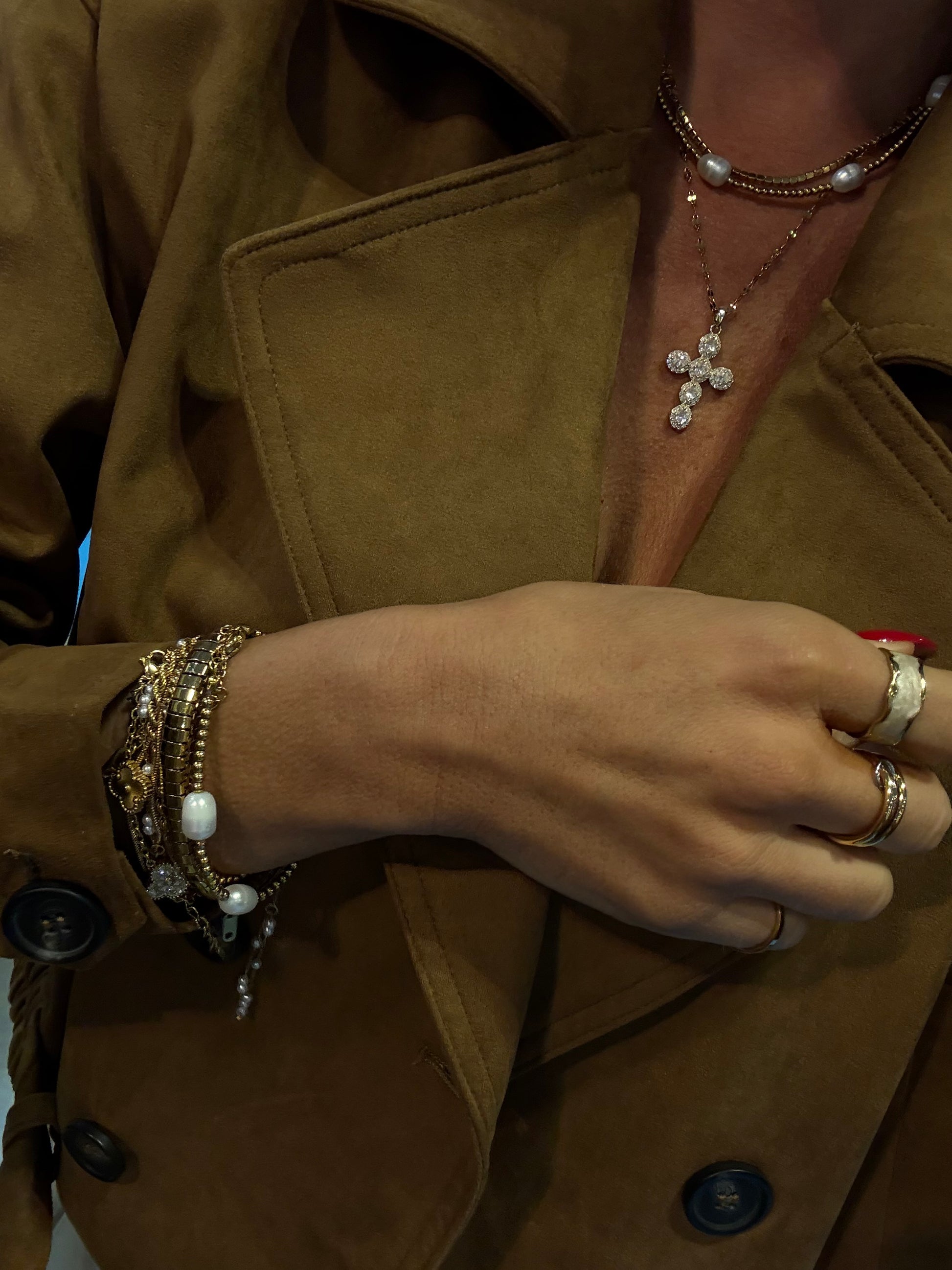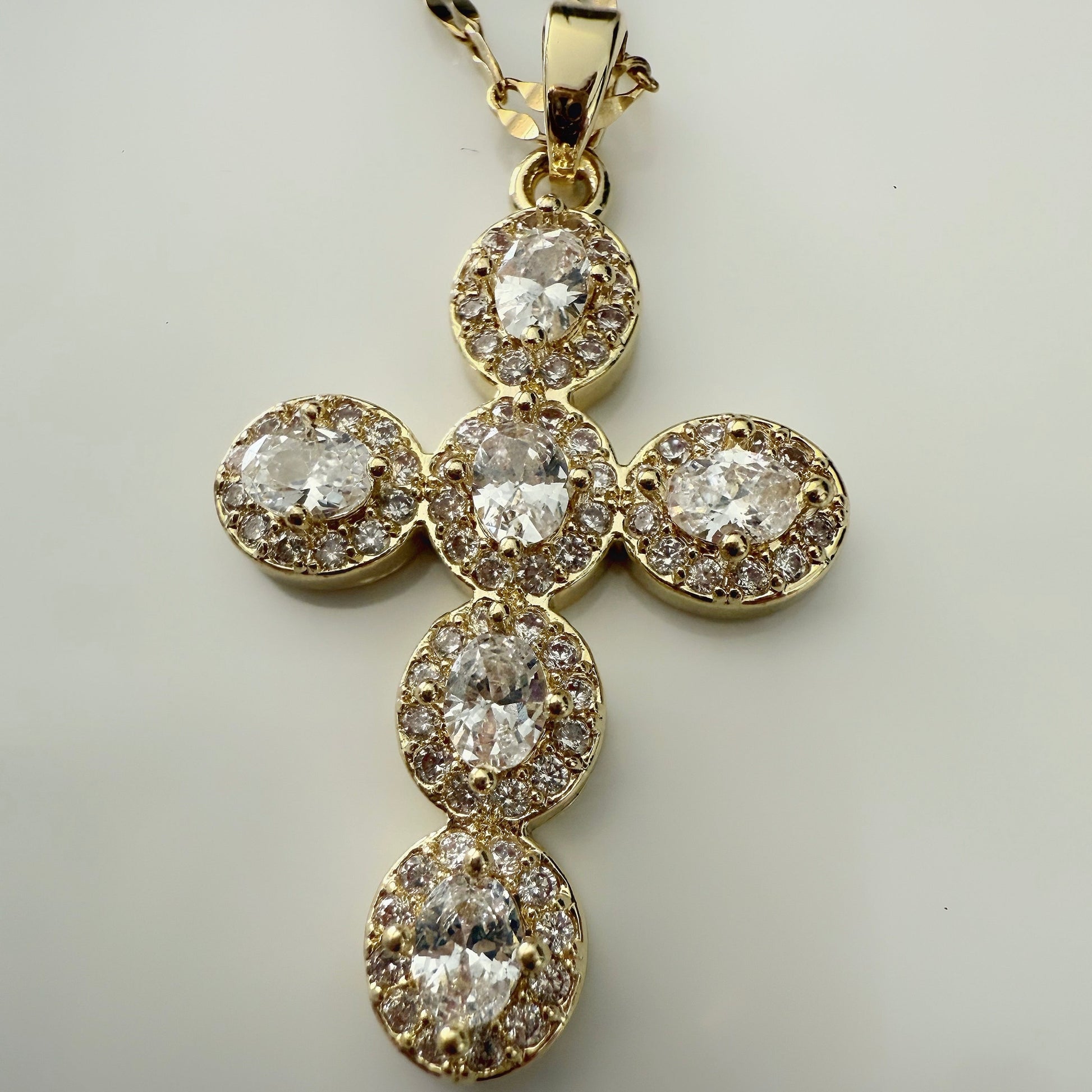 This radiant piece features an 18k gold-plated chain paired with a sparkling cross made of large oval-cut stones. Elegant and timeless.