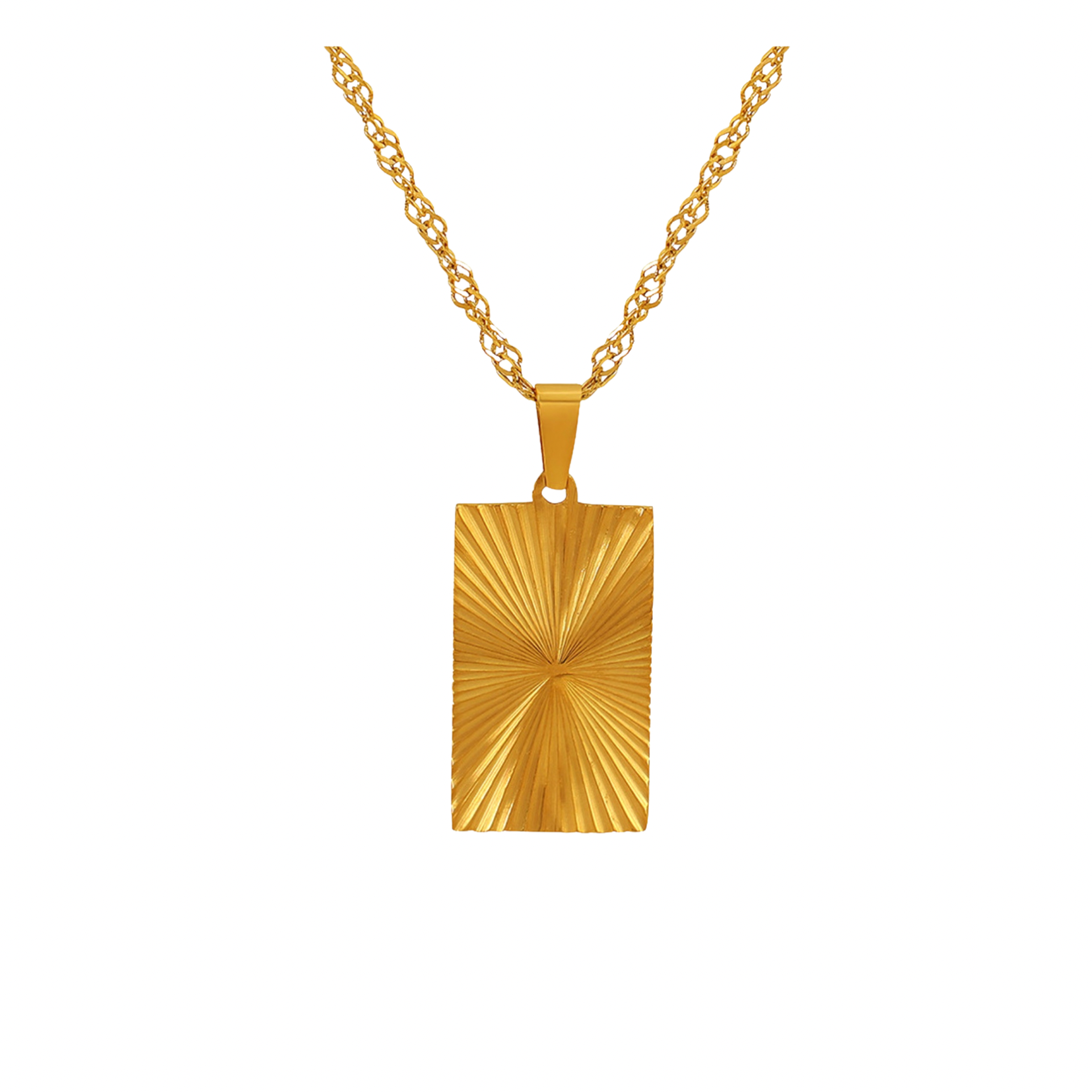 The Golden Ray Pendant Necklace features a sleek rectangular pendant with a radiant sunburst design, catching every glimmer of light in the most luxe way. Crafted from waterproof, tarnish-free gold over stainless steel, it’s the perfect modern classic to elevate your everyday look.