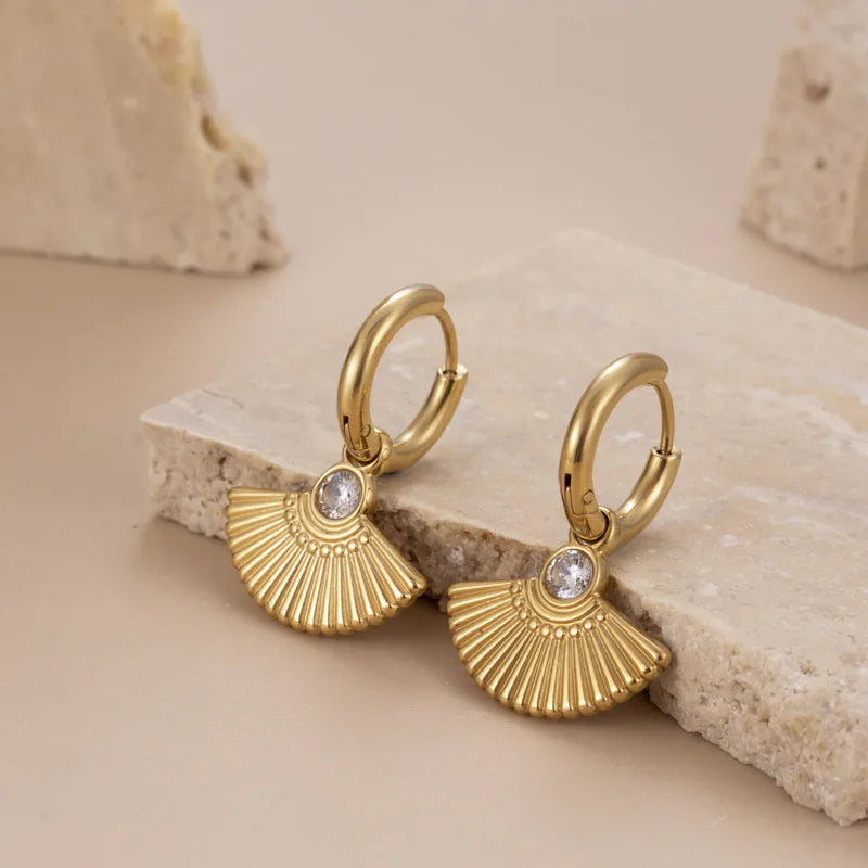 Say hello to the perfect little statement. The Gwen Huggies feature a smooth gold hoop paired with a radiant fan-shaped drop and a sparkling crystal detail — giving you that soft, elevated, rich-girl glow with every turn of your head.