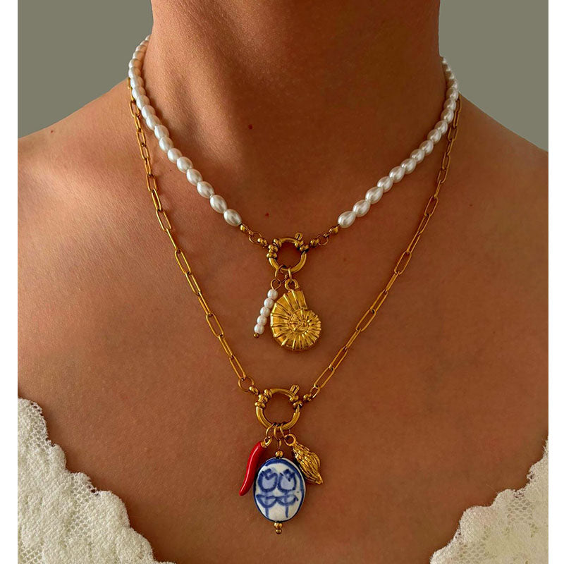 Eclectic and full of coastal charm, the Mediterranean Muse Charm necklace is a statement piece straight from your vacation dreams. This paperclip chain with gold shell and pearl drop charms, and a second chain adorned with a ceramic pendant, a red chili charm, and a gold fig leaf.