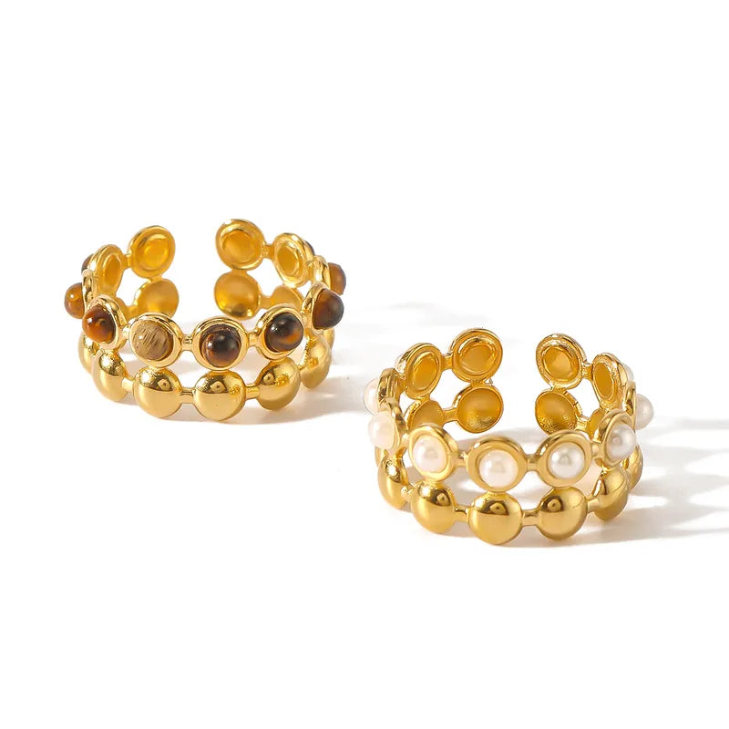 A timeless statement made modern. The Nora Ring features round, polished details that catch the light from every angle, designed with an open-band fit for everyday comfort. Choose between luminous pearls for a soft, feminine finish or tiger’s eye stones for a rich, earthy edge.
