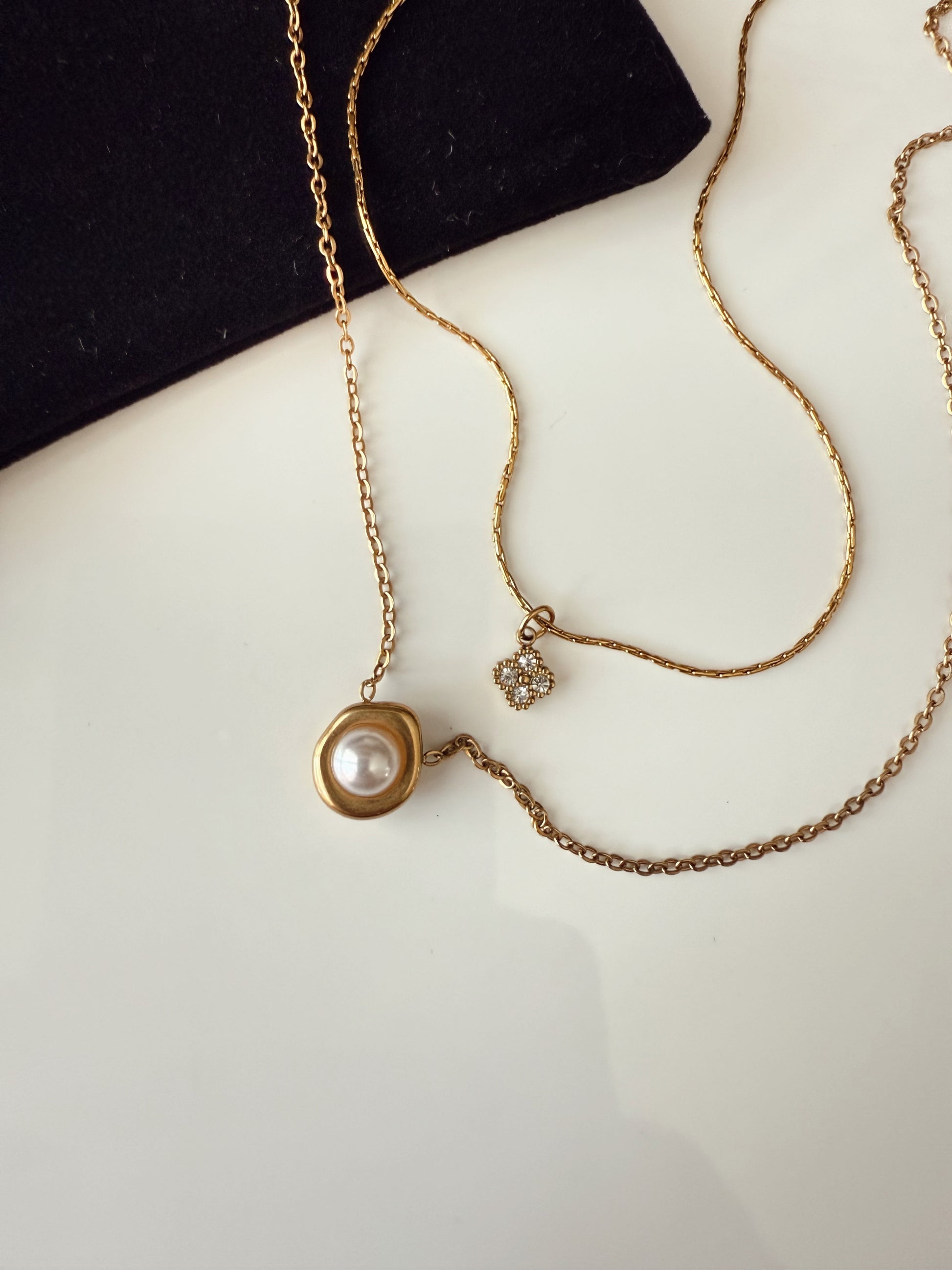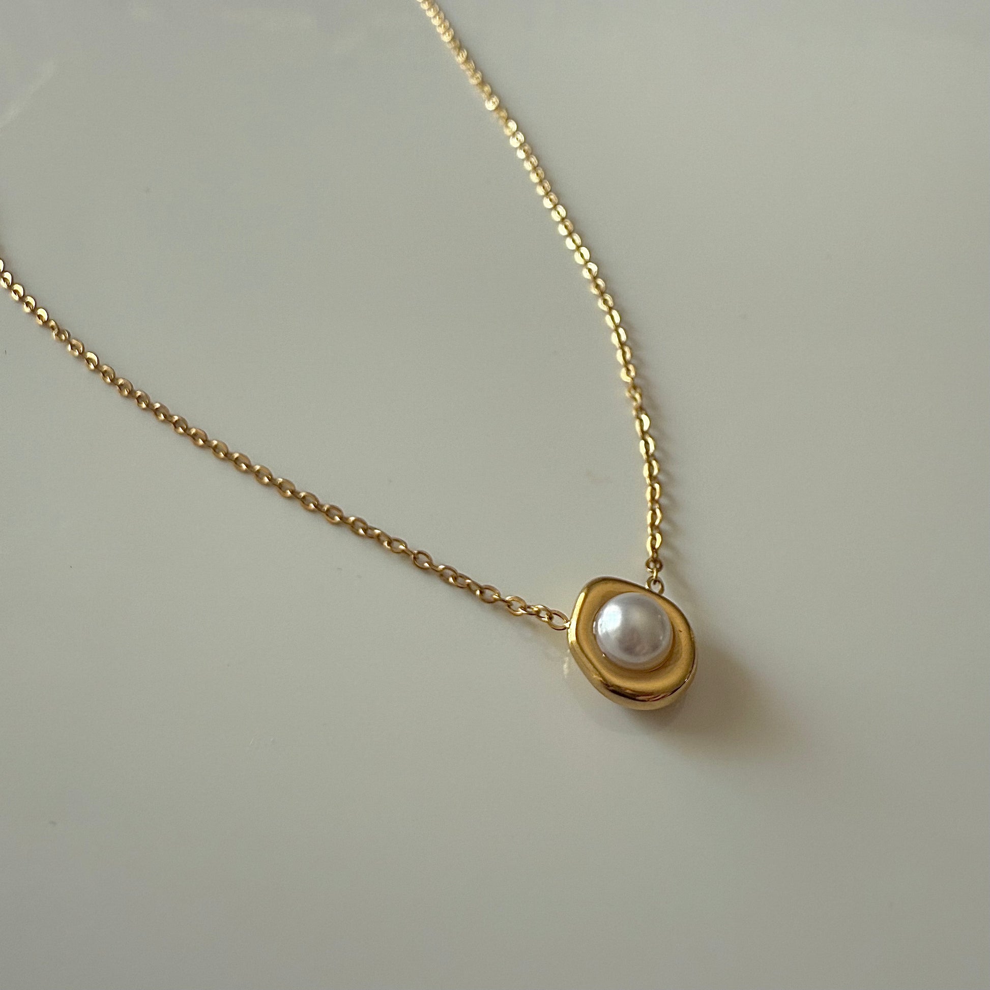 A golden treasure with coastal charm—this necklace features a sculptural gold setting wrapped around a luminous pearl, like a gem plucked from the tide. It's dainty, unique, and effortlessly chic.