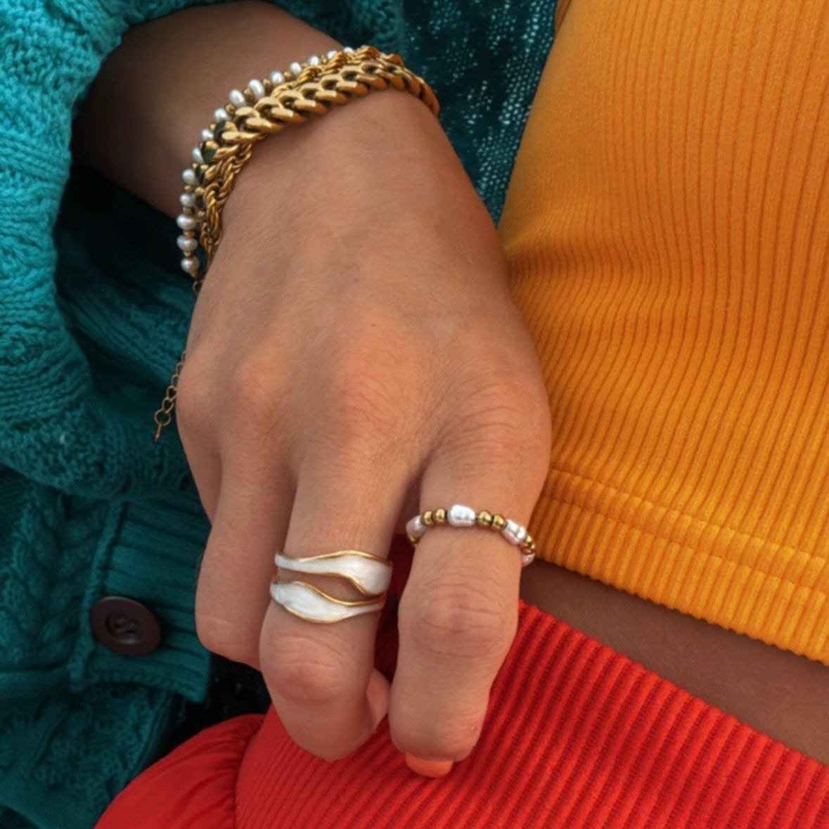 The Coastal Double Stack Ring features a wavy, layered design that brings beachy elegance to your everyday look. With its open adjustable fit, you can wear it on any finger—just pull apart or push together for the perfect fit. This piece is lightweight, water-resistant, and totally stack-worthy.
