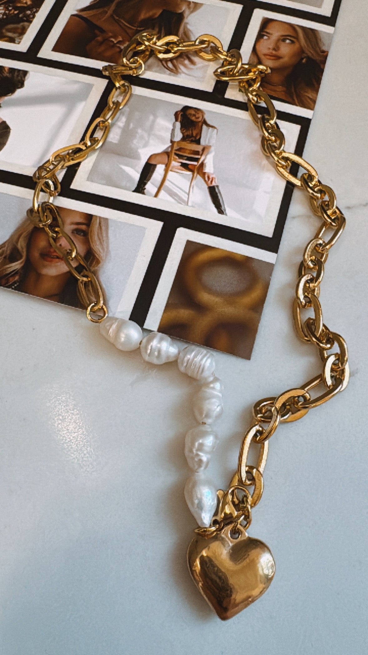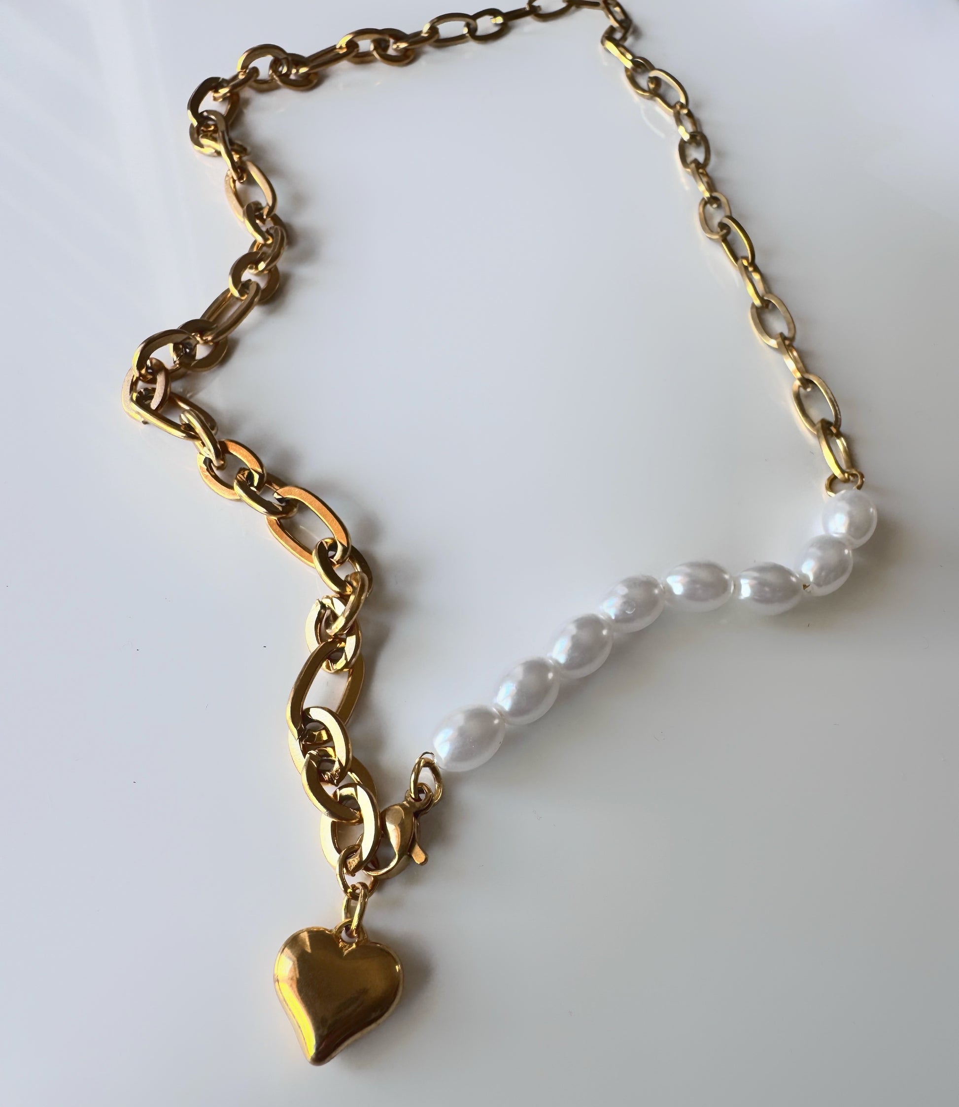 An edgy twist on a romantic classic. Half chunky gold chain, half delicate pearls, finished with a dainty heart charm that clasps in the front for an effortlessly cool vibe. She’s giving “don’t mess with me” energy—with a soft side.