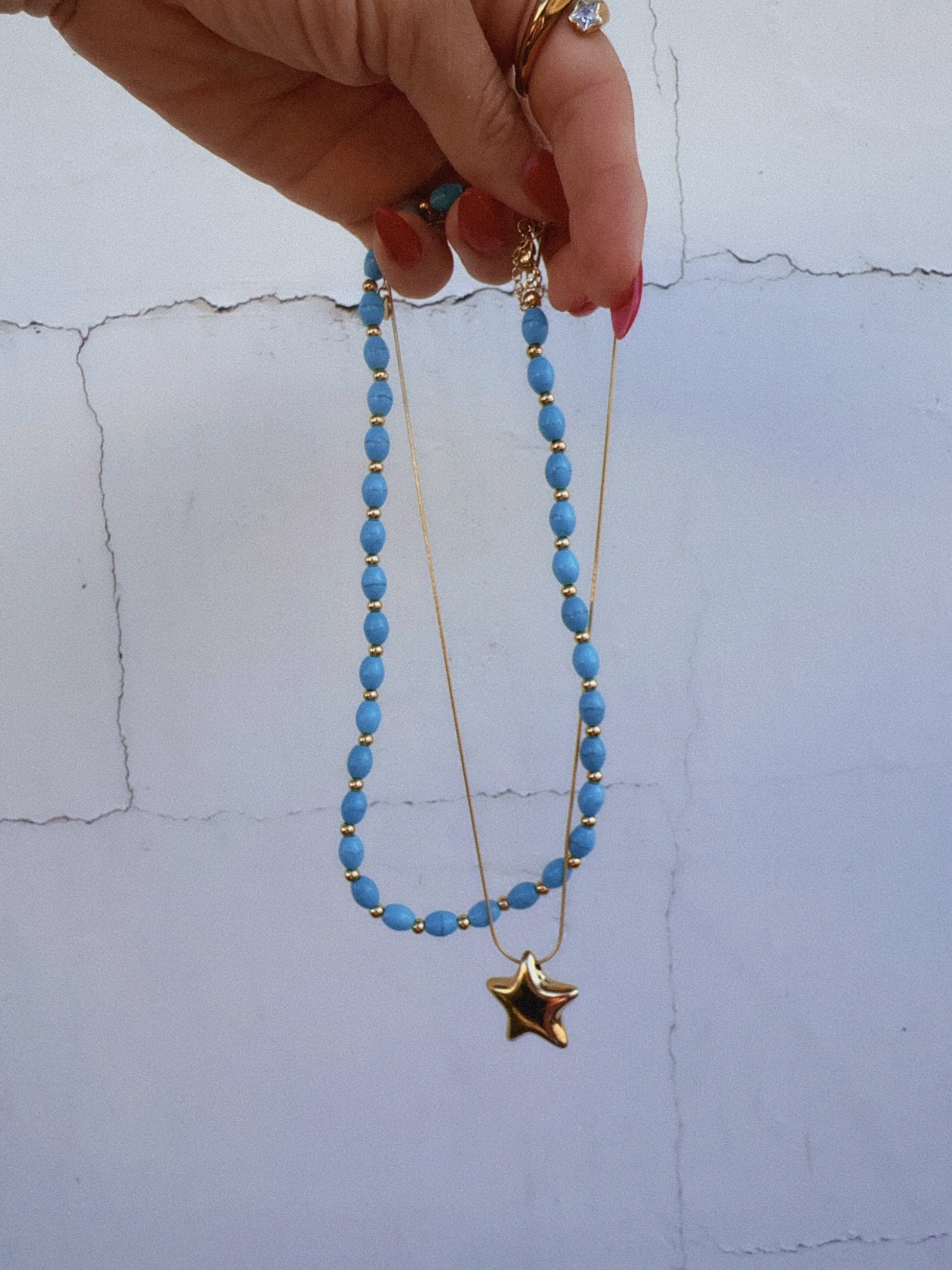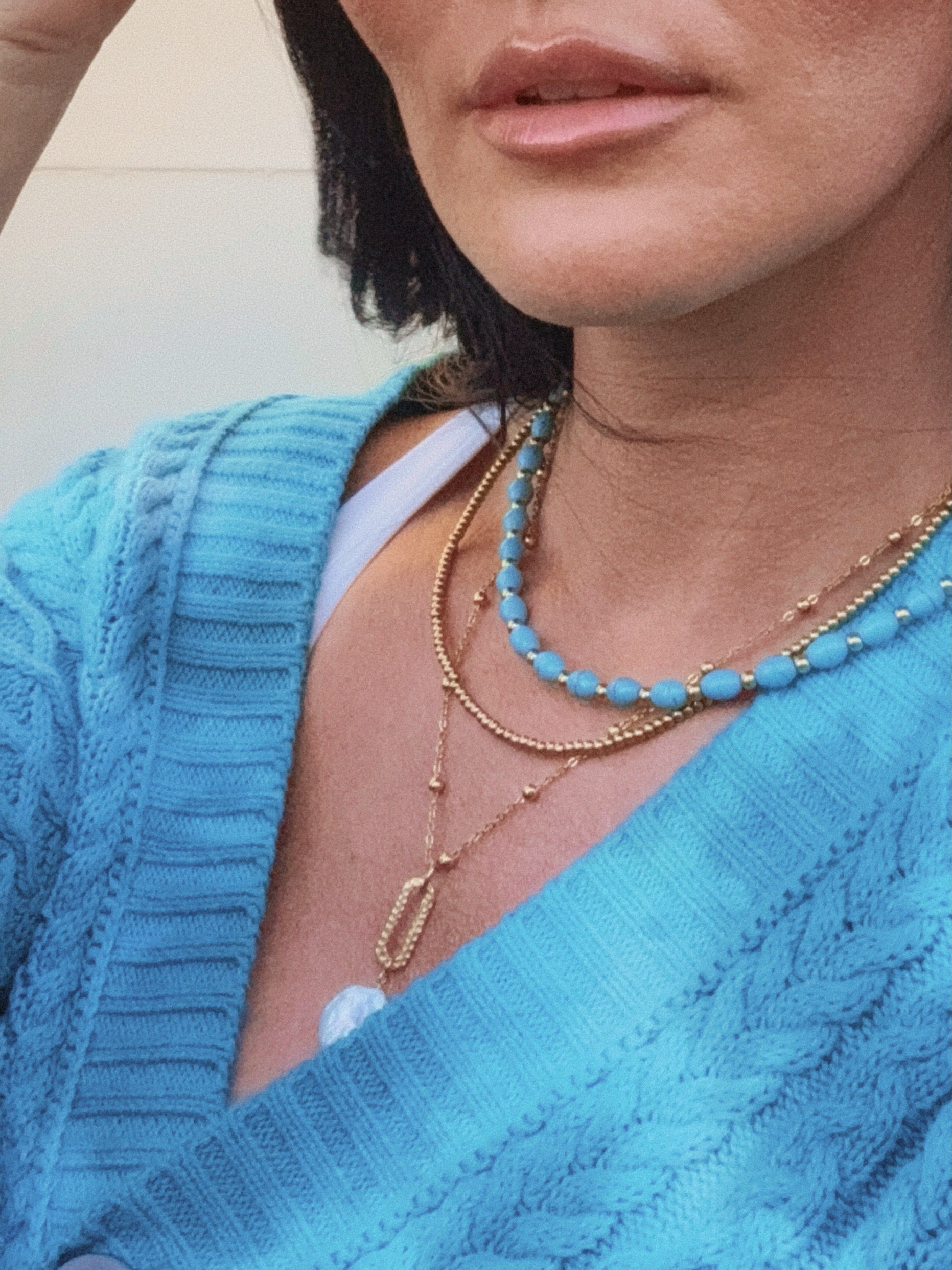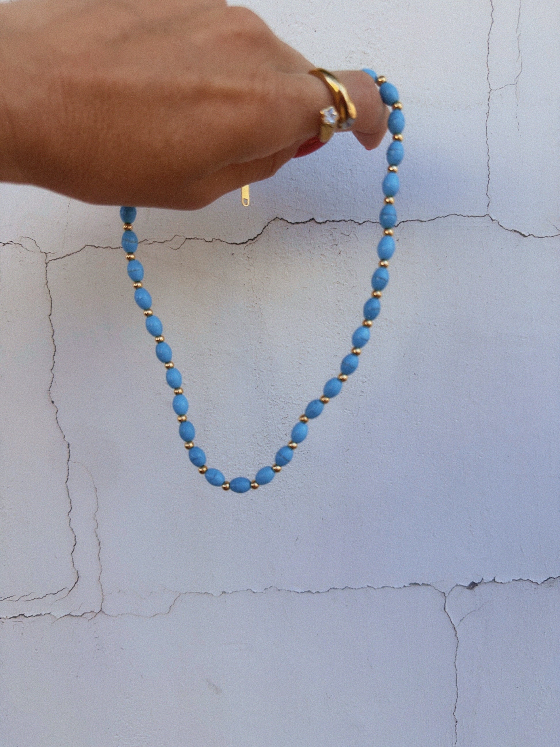 This bead choker features gold accents and a vibrant blue that screams sunshine and sparklers. Made for layering or standing out solo.