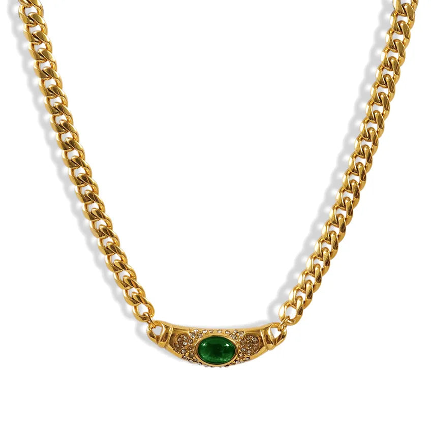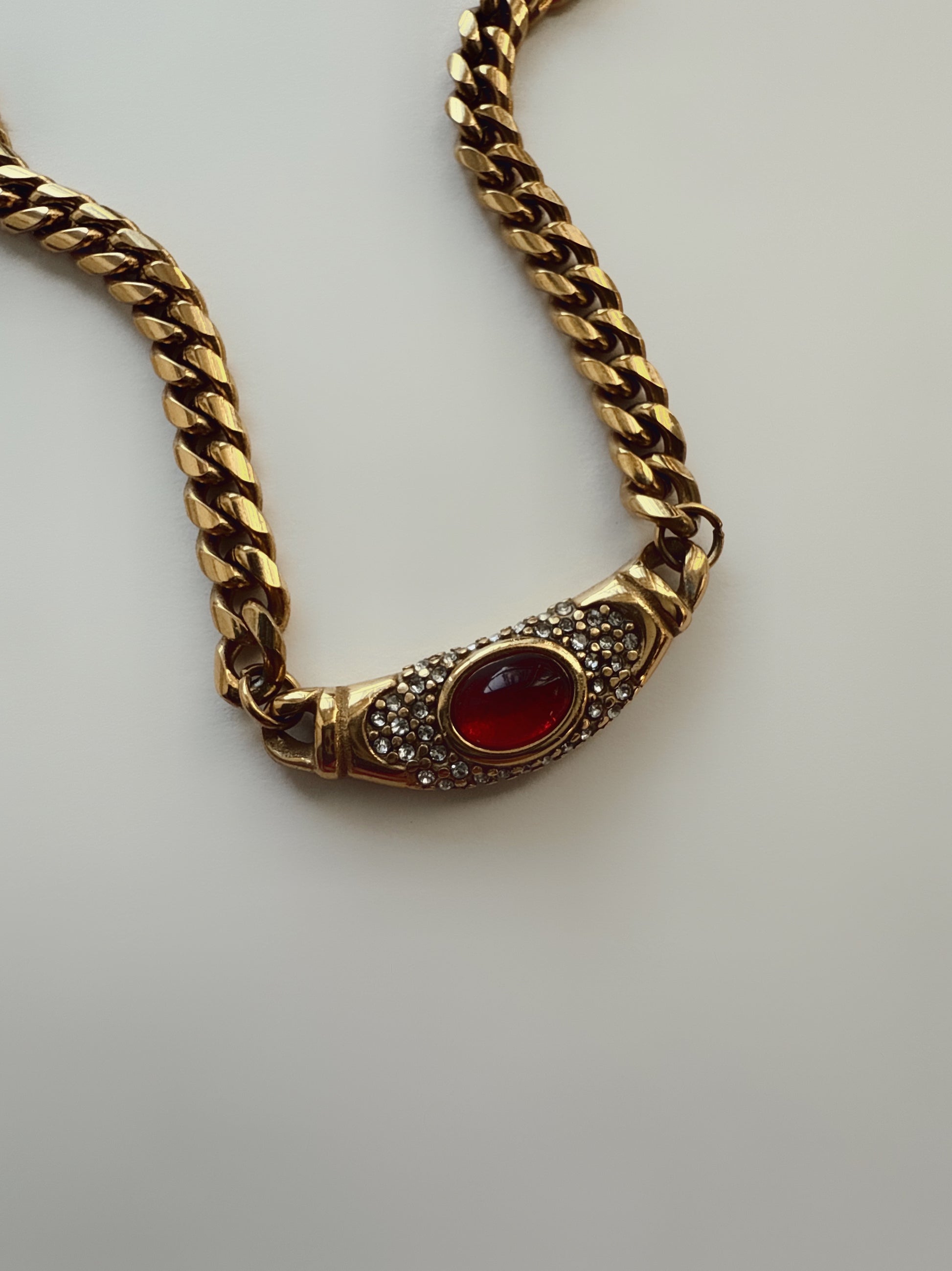A bold gold chain finished with a scarlet stone. Strong enough to wear solo.