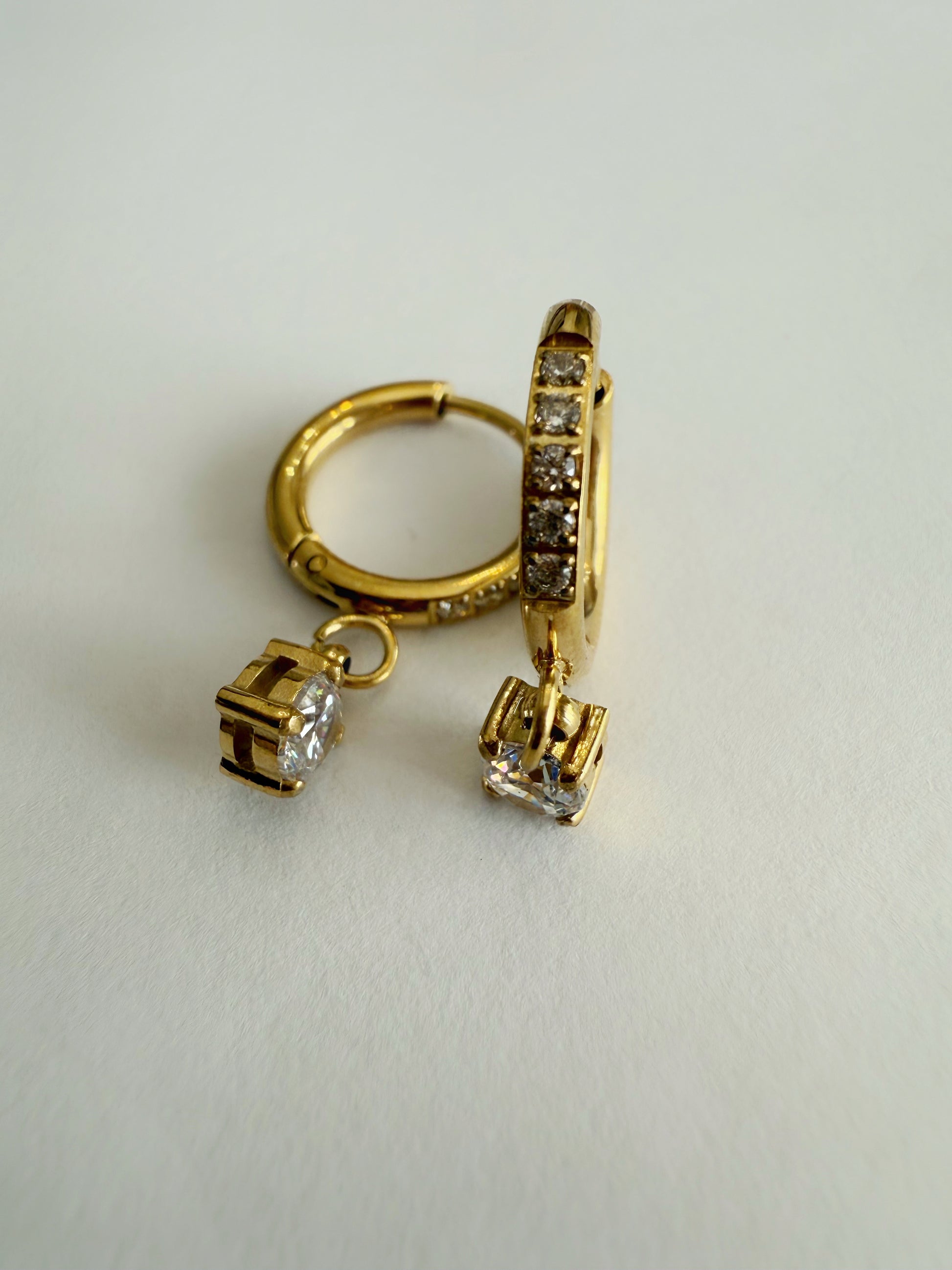 Your new go-to sparkle. These dainty huggies feature a row of shimmering pavé stones and a dangling crystal charm that catches the light with every move. Designed for daily wear with just enough glam to turn heads.