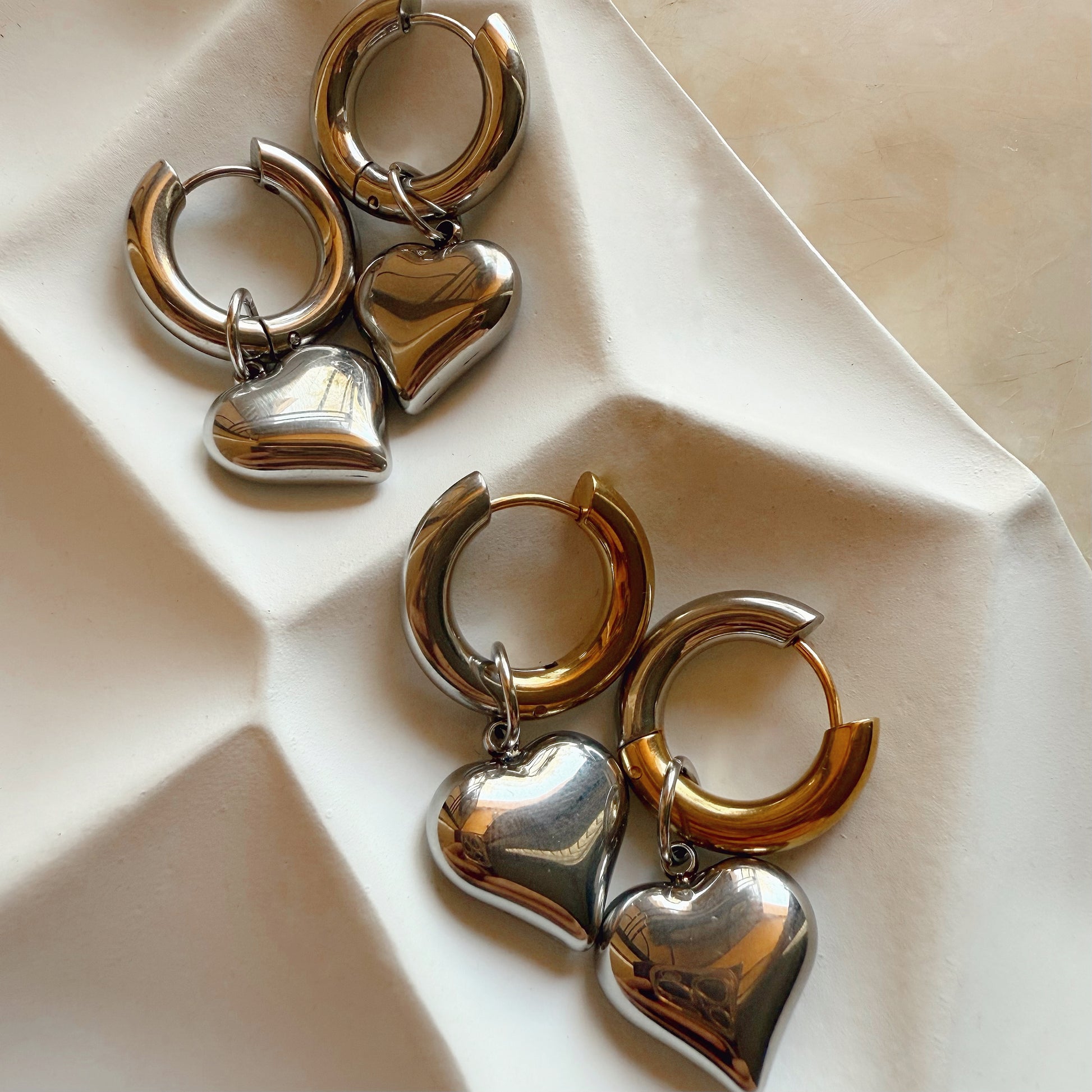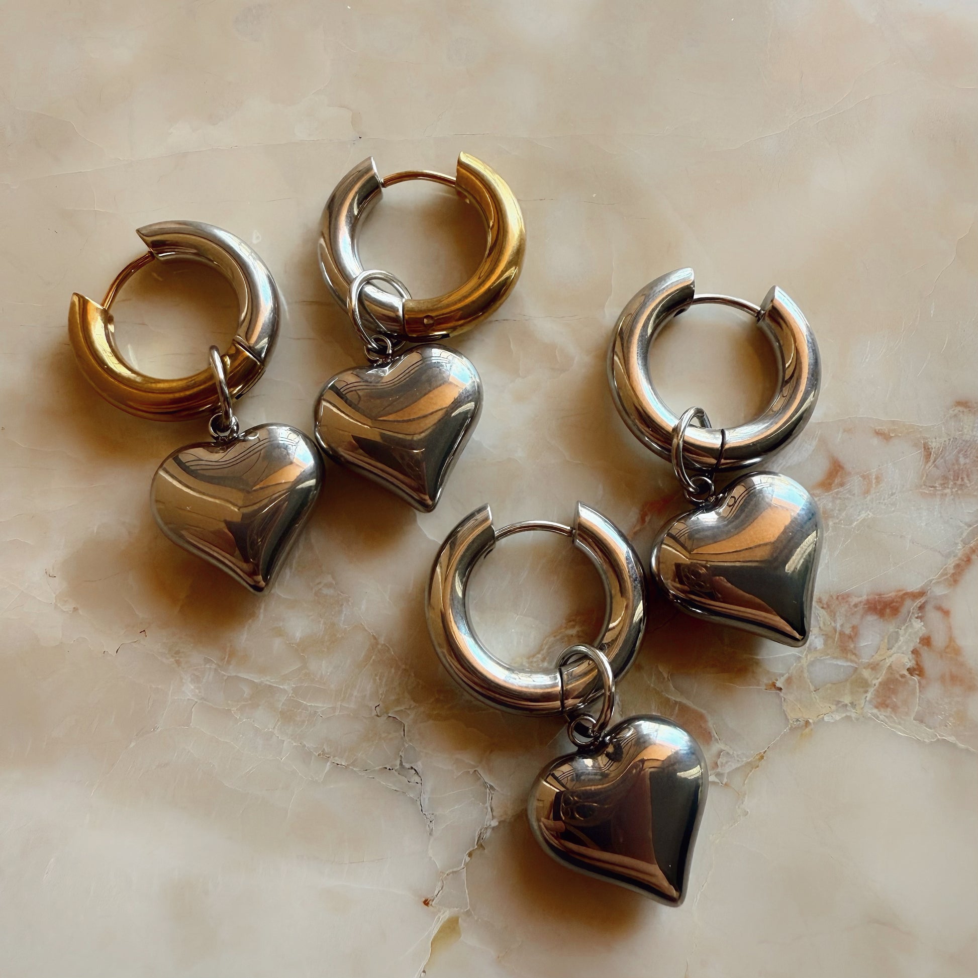 Playful yet polished. The Stella Heart Huggies feature sleek gold hoops with a chic silver heart charm — mixing metals for the perfect balance of trendy and timeless. Lightweight, waterproof, and easy to style, they’re made for everyday wear with a luxe twist.