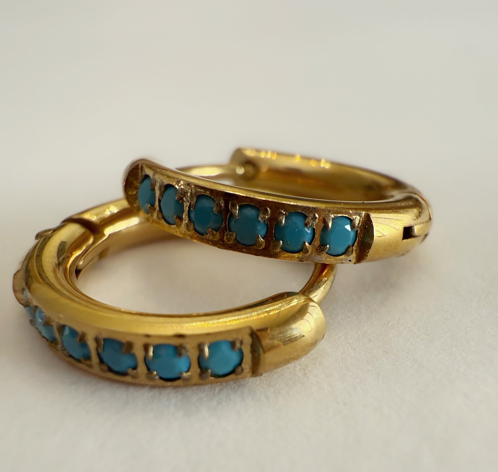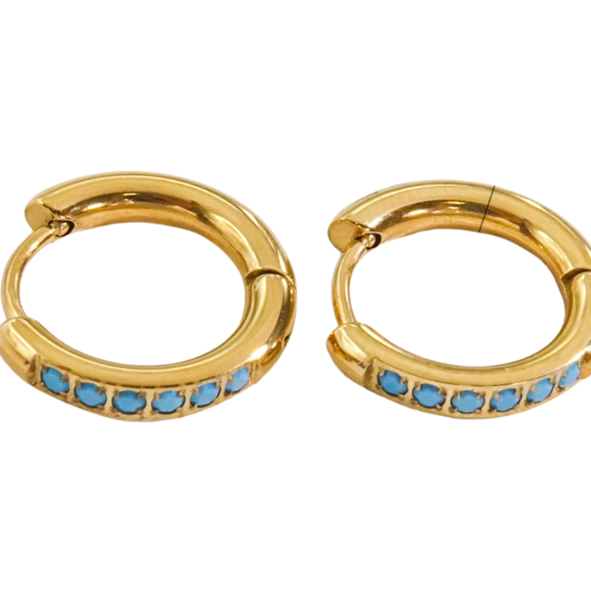 Tiny hoops, big impact. The Turquoise Tide Huggies are the perfect pop of color for your coastal glow-up. These 12mm gold hoops feature a delicate row of turquoise stones, giving effortless beachy vibes with everyday wearability. Lightweight and water-resistant, they’re made to live in—whether you’re poolside, in the city, or layering with your fave statement pieces.